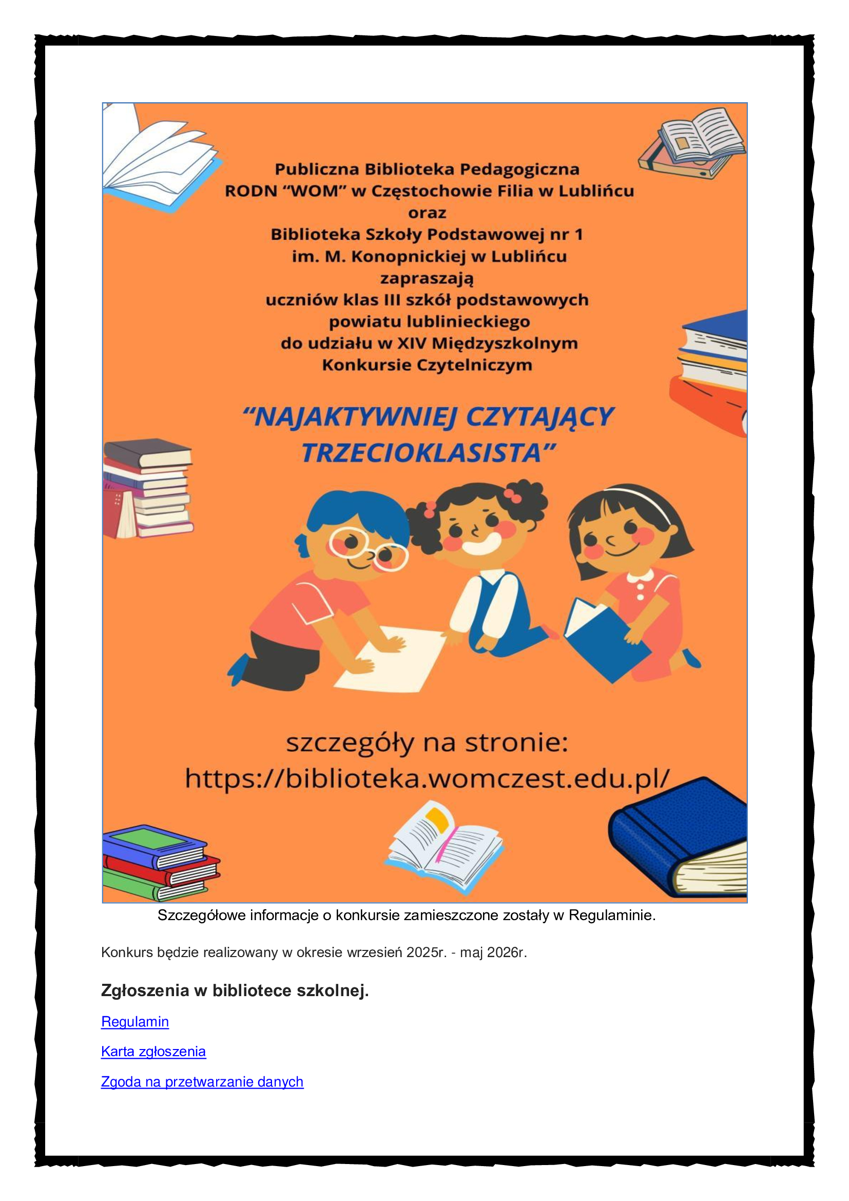 12.06.2023 r. został rozstrzygnięty konkurs czytelniczy „Najaktywniej Czytający Trzecioklasista”, którego organizatorami była Publiczna Biblioteka Pedagogiczna RODN „WOM” w Częstochowie Filia w Lublińcu i biblioteka Szkoły Podstawowej nr 1 w Lublińcu.