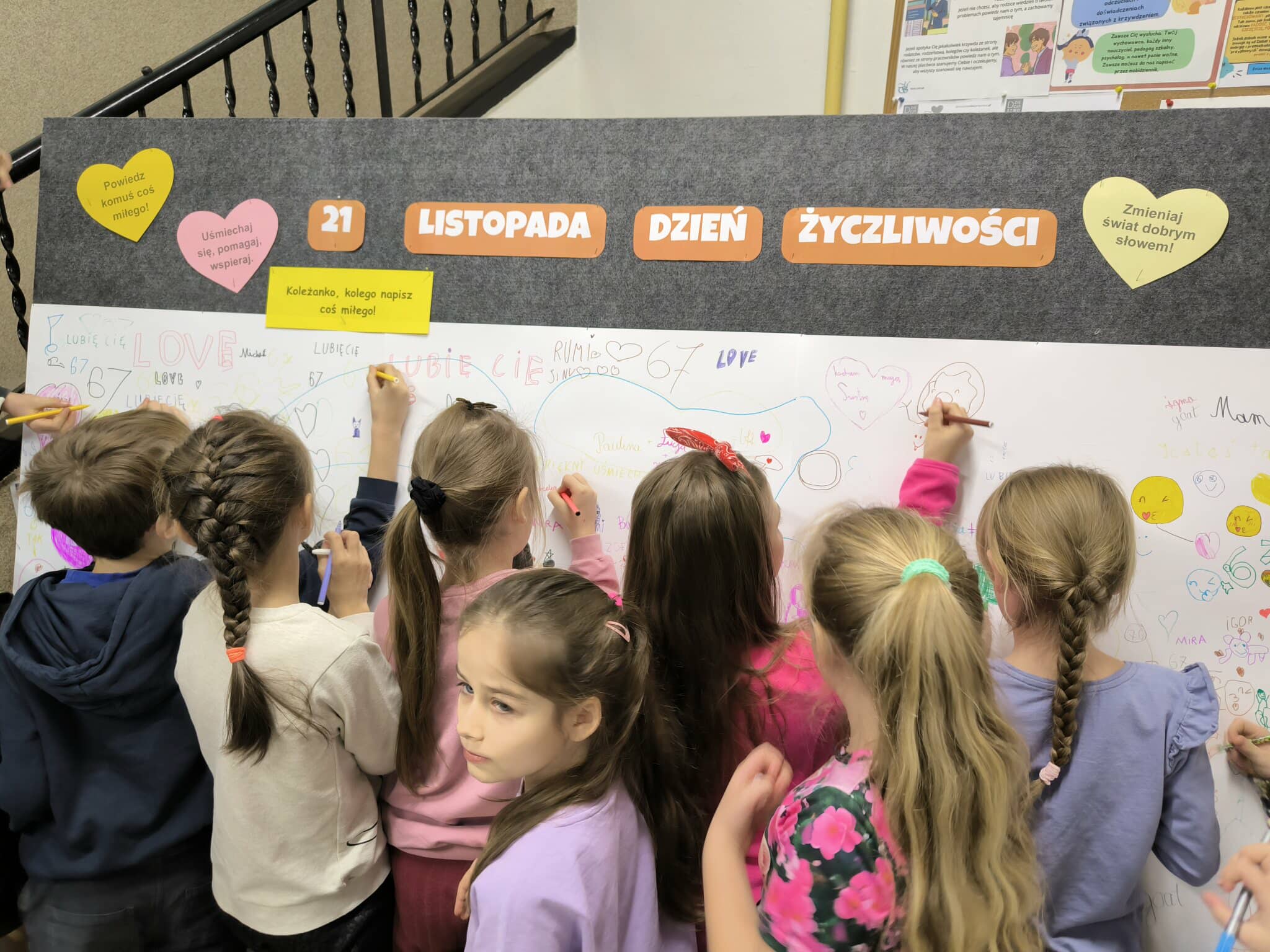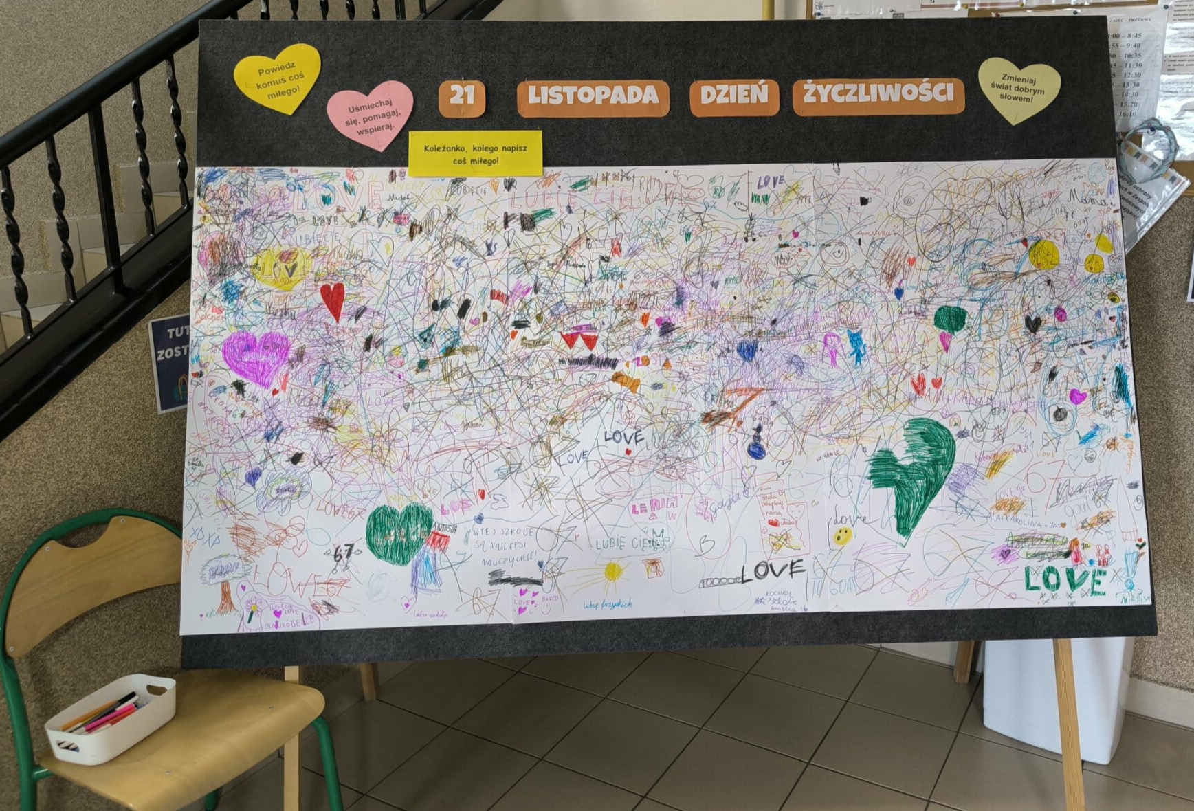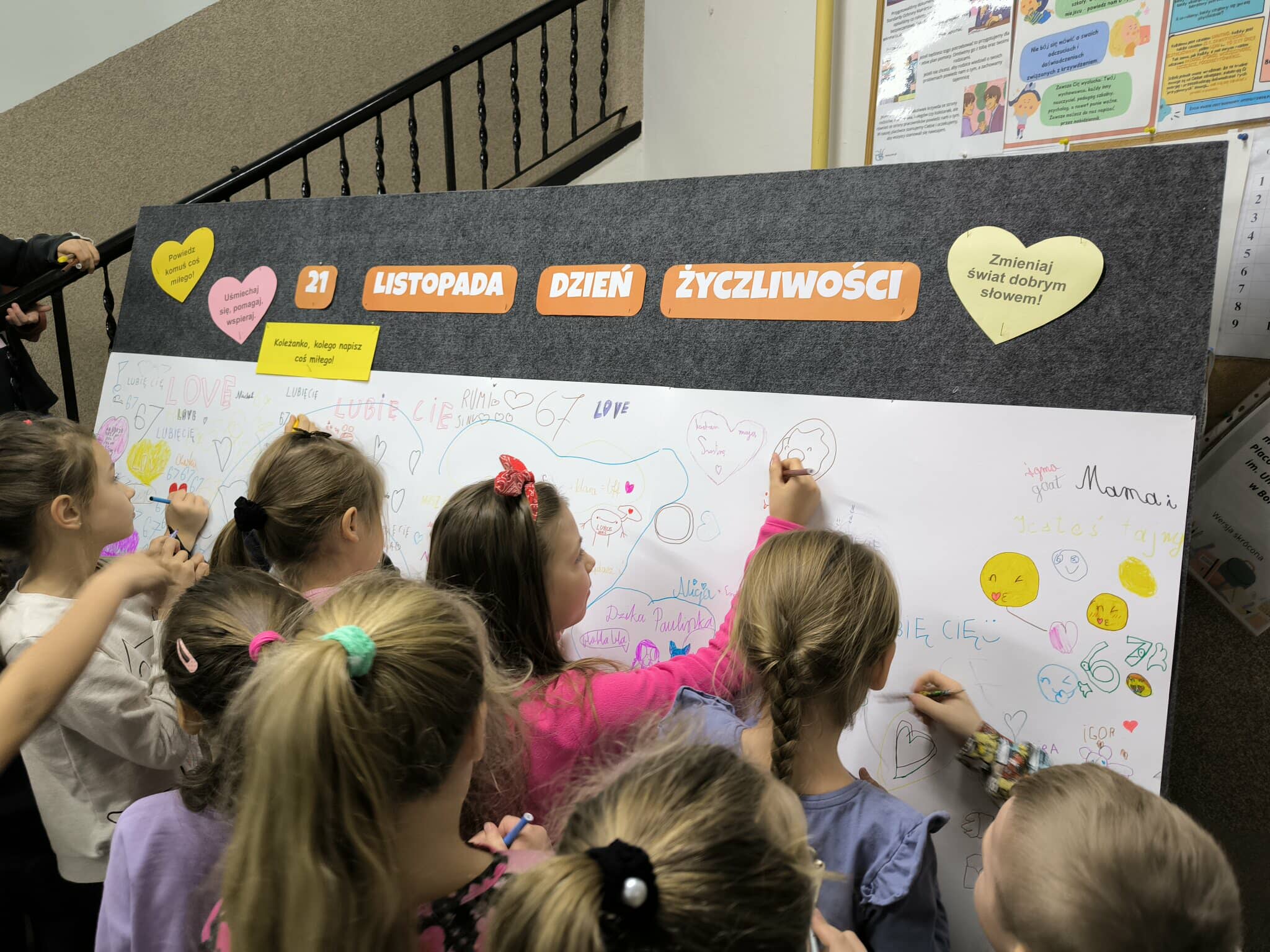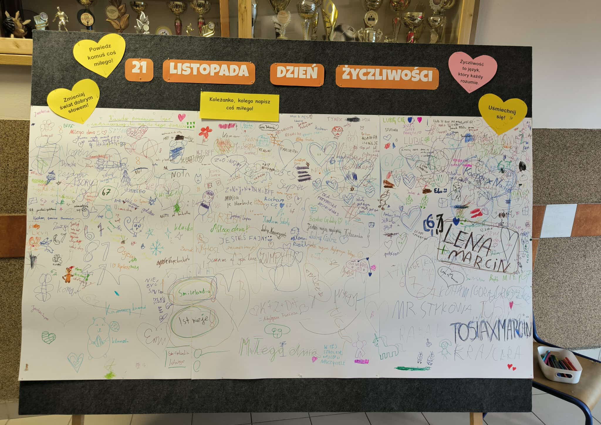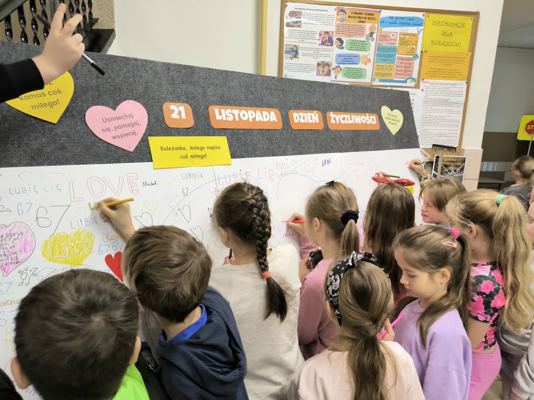 W przestrzeni szkoły pojawiły się również tablice do napisania miłego słowa, na których każdy mógł pozostawić krótki, życzliwy komunikat dla innych. Tablice szybko zapełniły się pozytywnymi wpisami, pokazując, że życzliwość naprawdę ma moc łączenia ludzi.