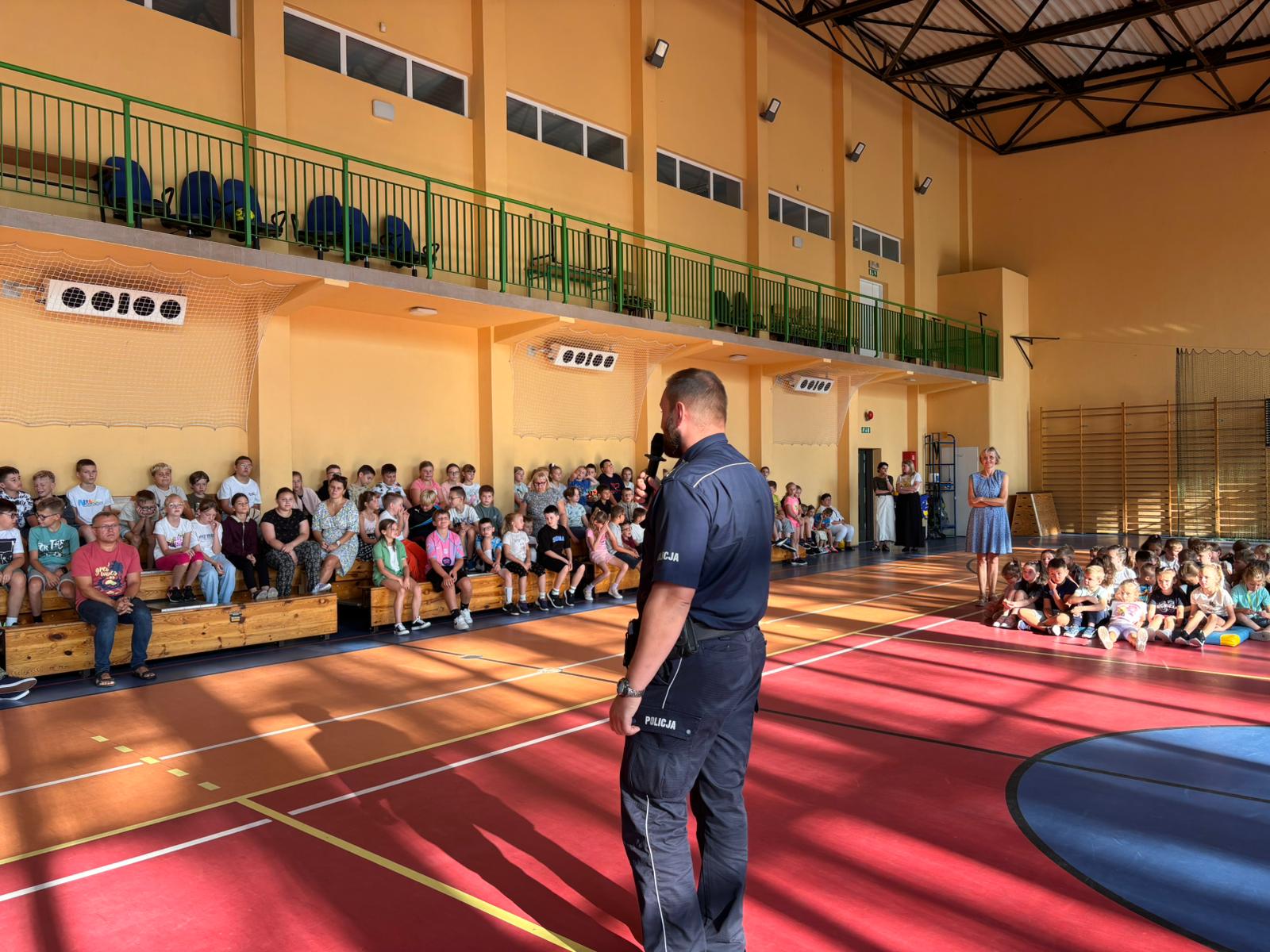 Dnia 5 września 2025 roku w naszej placówce odbyło się spotkanie uczniów z panem dzielnicowym st.asp. Sebastianem Kowalikiem. Podczas spotkania przypomniano najważniejsze zasady dotyczące bezpieczeństwa na terenie szkoły i w drodze do niej. Omówiono między innymi zasady poruszania się po ulicy, chodniku i podczas jazdy rowerem, hulajnogą oraz samochodem. Zwrócono szczególną uwagę na to, że bardzo ważnym elementem zwiększającym bezpieczeństwo na drodze jest noszenie na sobie elementów odblaskowych. Natomiast rodzice, którzy zawożą dzieci do szkoły powinni pamiętać o obowiązku przewożenia ich w fotelikach ochronnych lub specjalnych siedziskach. Przypomniano uczniom, że bezpieczeństwo zależy od nas wszystkich.