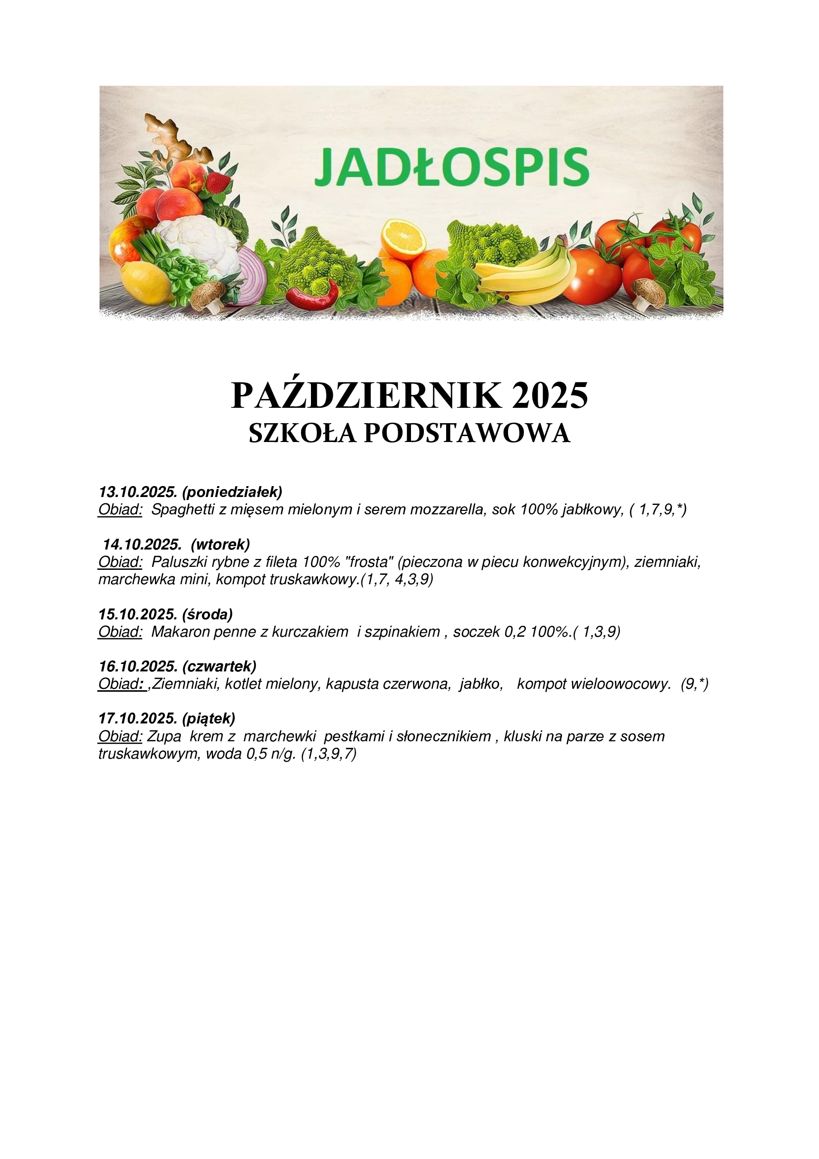 Jadłospis SP 13.10.2025 r. - 17.10.2025 r.