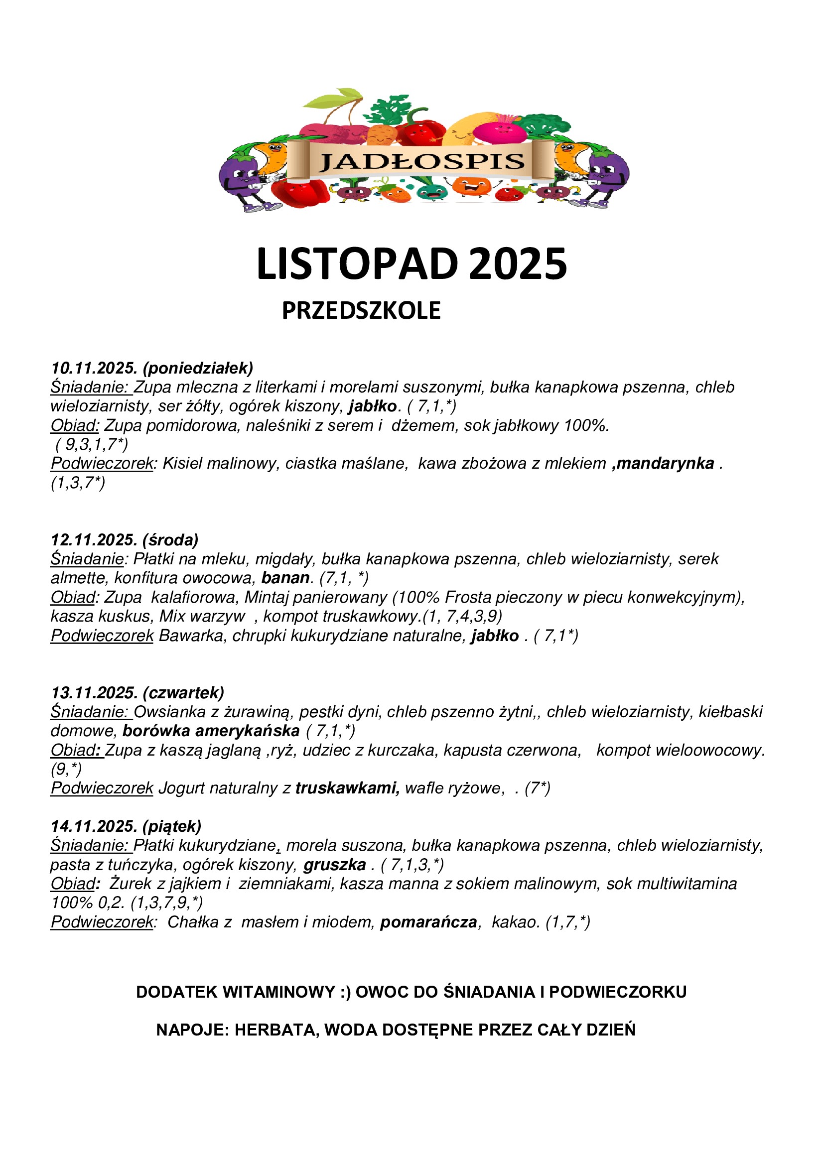 Jadłospis Przedszkole 10.11.2025 r. - 14.11.2025 r.