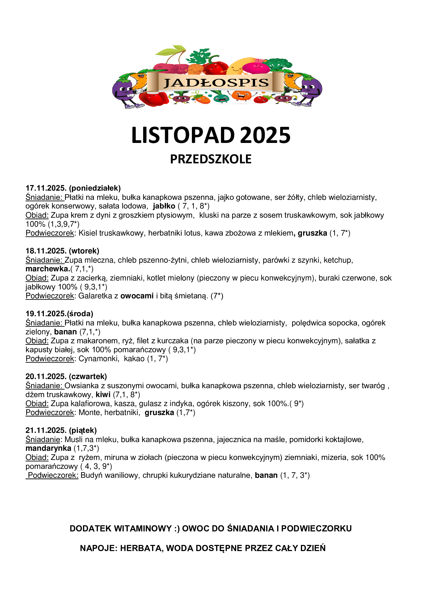 Jadłospis Przedszkole 17.11.2025 r. - 21.11.2025 r.