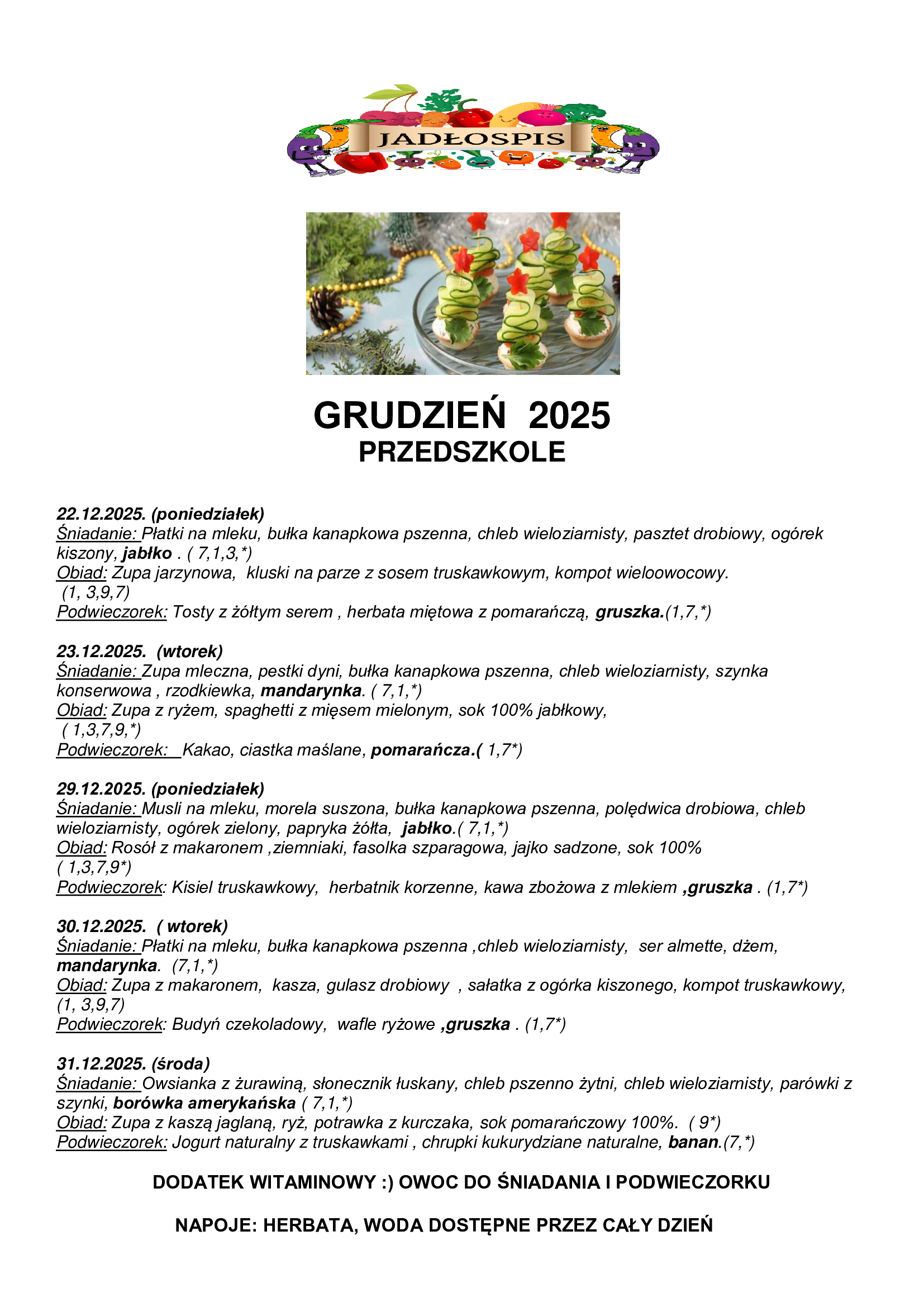 Jadłospis Przedszkole 22.12.2025 r. - 31.12.2025 r.