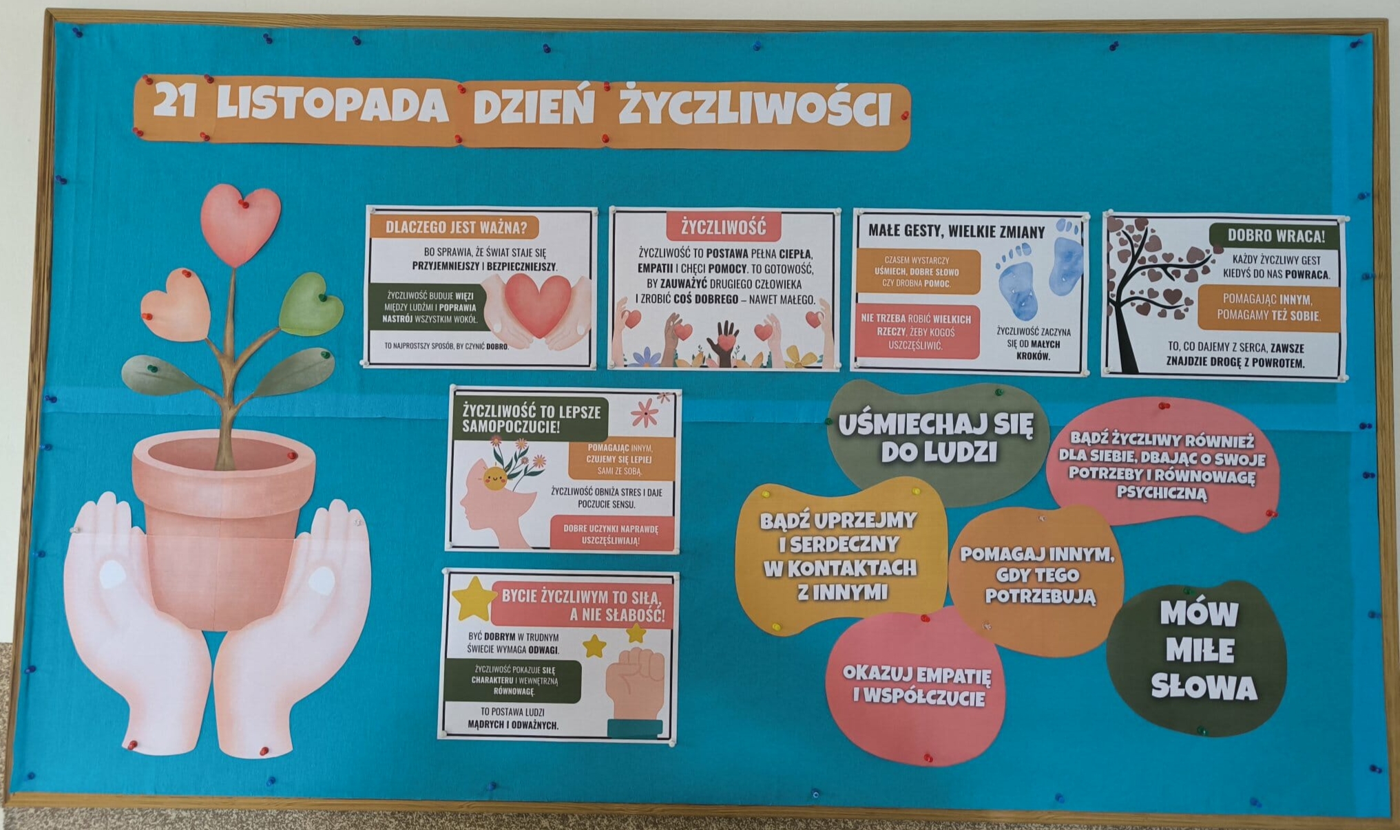 21 listopada społeczność naszej szkoły obchodziła Dzień Życzliwości. Z tej okazji przygotowano kolorową gazetkę tematyczną oraz wystawę prac uczniów, uczniowie przedstawili w nich, jak ważne jest okazywanie sobie dobroci na co dzień oraz jak drobne gesty mogą zmienić świat na lepszy.