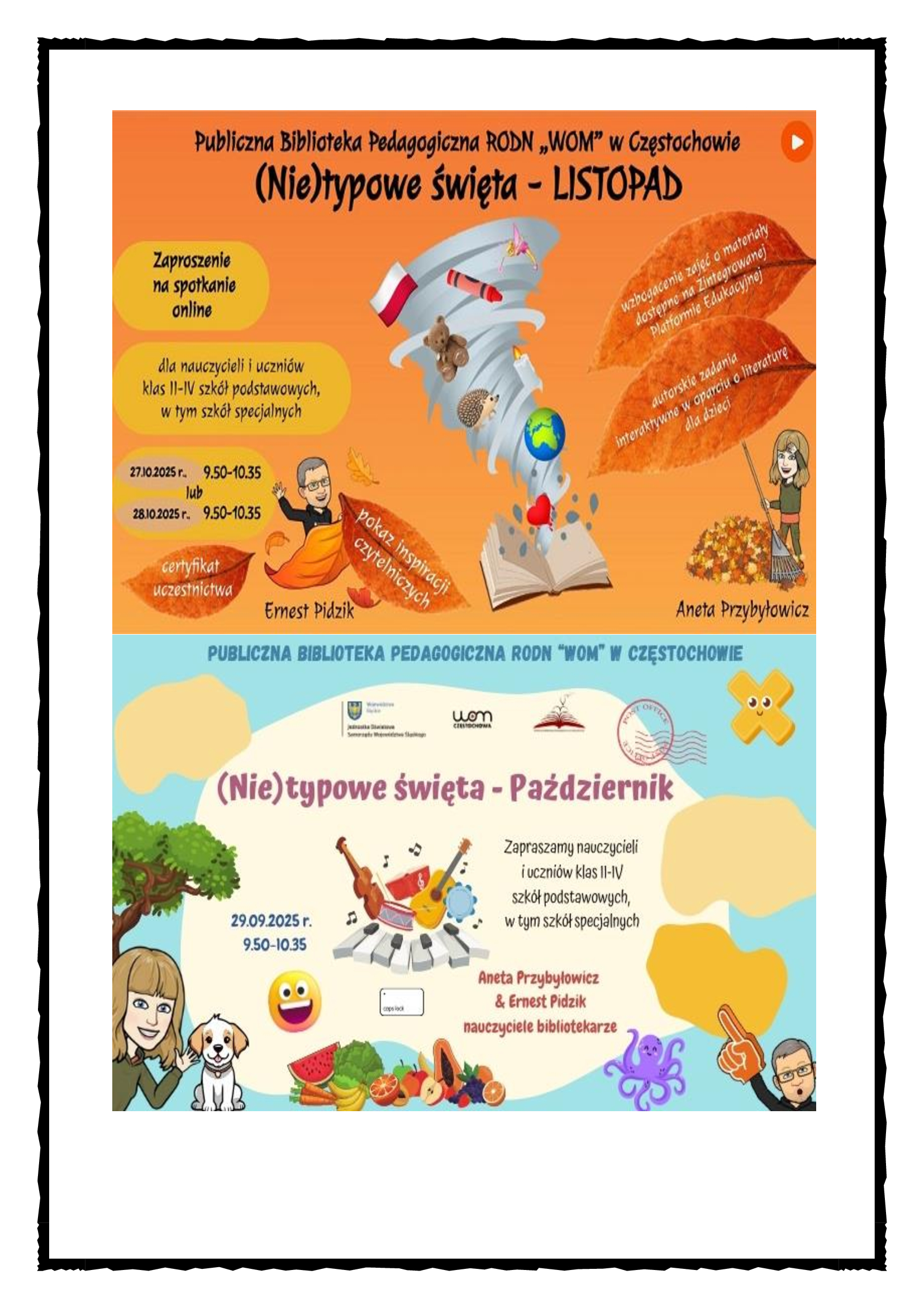 Publiczna Biblioteka Pedagogiczna RODN „WOM” w Częstochowie zaprasza nauczycieli i uczniów klas 0-4 oraz nauczycieli i dzieci z przedszkoli na spotkanie online Dzień Czarnego Kota. Spotkanie online odbędzie się 15 listopada 2024 r. w godz. 10.45 – 11.30 na platformie ClickMeeting. Informacje dotyczące warunków uczestnictwa: dzieci i uczniowie uczestniczą w spotkaniu przebywając w swojej sali i oglądając transmisję wydarzenia udostępnioną przez nauczyciela. Na adres mailowy nauczyciela zostanie przesłany link aktywacyjny do wydarzenia zatytułowany Dzień Czarnego Kota.  Nauczyciel loguje się do wydarzenia wpisując swoje imię i nazwisko. Link zostanie wysłany…