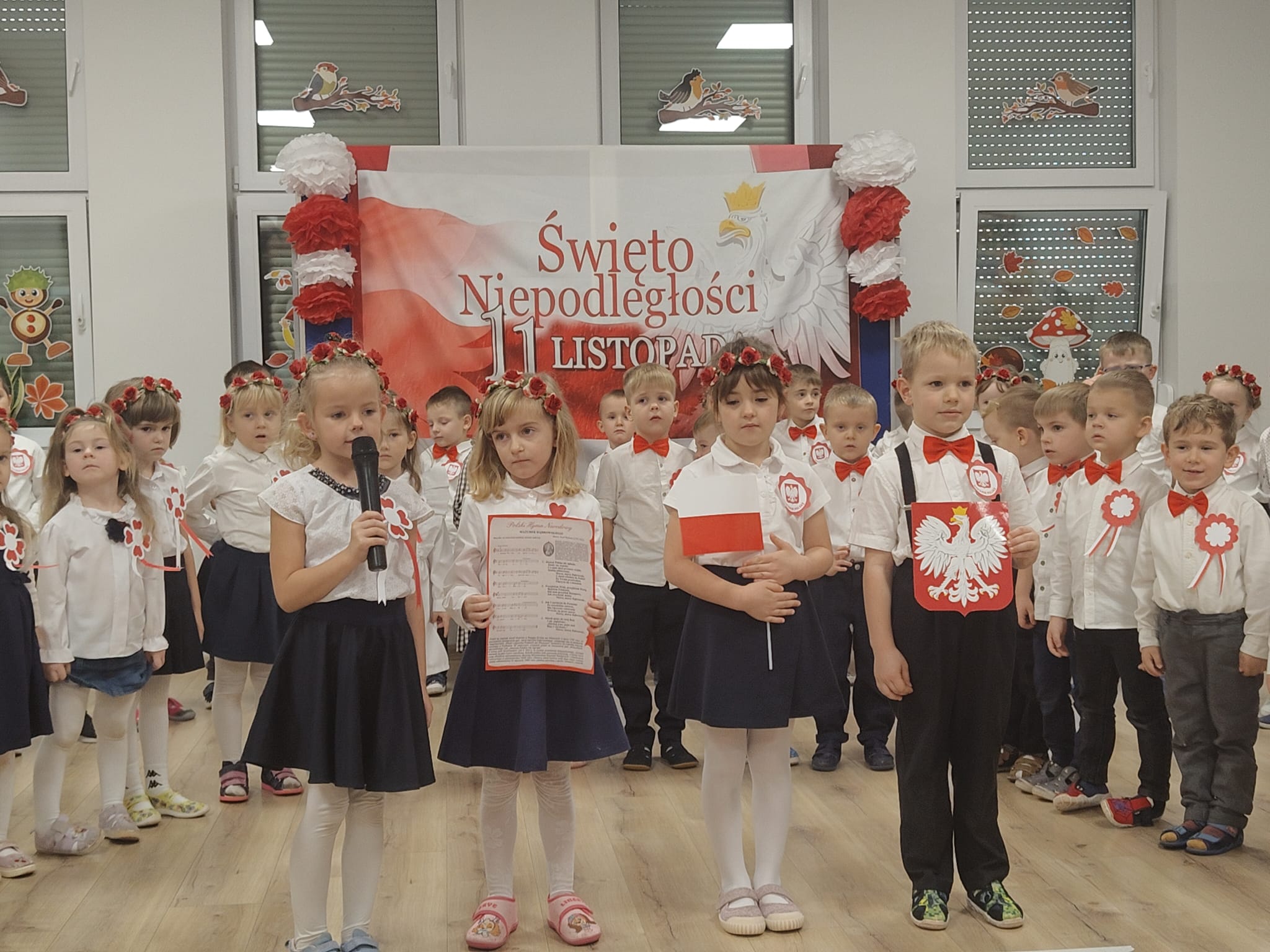 Podczas uroczystości dzieci recytowały wiersze patriotyczne oraz śpiewały piosenki związane z historią naszego kraju. Kulminacyjnym momentem uroczystości było wspólne odśpiewanie „Mazurka Dąbrowskiego” o godz. 11.11, w ramach akcji „Szkoła do hymnu”. Podczas występu najmłodsi pokazali, że potrafią z dumą i szacunkiem świętować ważne wydarzenia dla naszej ojczyzny. Uroczystość nie tylko przybliżyła przedszkolakom znaczenie Dnia Niepodległości, lecz także stała się okazją do kształtowania postaw patriotycznych oraz poczucia przynależności do wspólnoty narodowej.