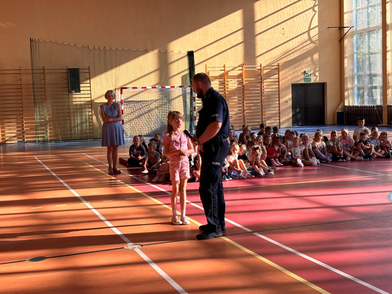 Dnia 5 września 2025 roku w naszej placówce odbyło się spotkanie uczniów z panem dzielnicowym st.asp. Sebastianem Kowalikiem. Podczas spotkania przypomniano najważniejsze zasady dotyczące bezpieczeństwa na terenie szkoły i w drodze do niej. Omówiono między innymi zasady poruszania się po ulicy, chodniku i podczas jazdy rowerem, hulajnogą oraz samochodem. Zwrócono szczególną uwagę na to, że bardzo ważnym elementem zwiększającym bezpieczeństwo na drodze jest noszenie na sobie elementów odblaskowych. Natomiast rodzice, którzy zawożą dzieci do szkoły powinni pamiętać o obowiązku przewożenia ich w fotelikach ochronnych lub specjalnych siedziskach. Przypomniano uczniom, że bezpieczeństwo zależy od nas wszystkich.