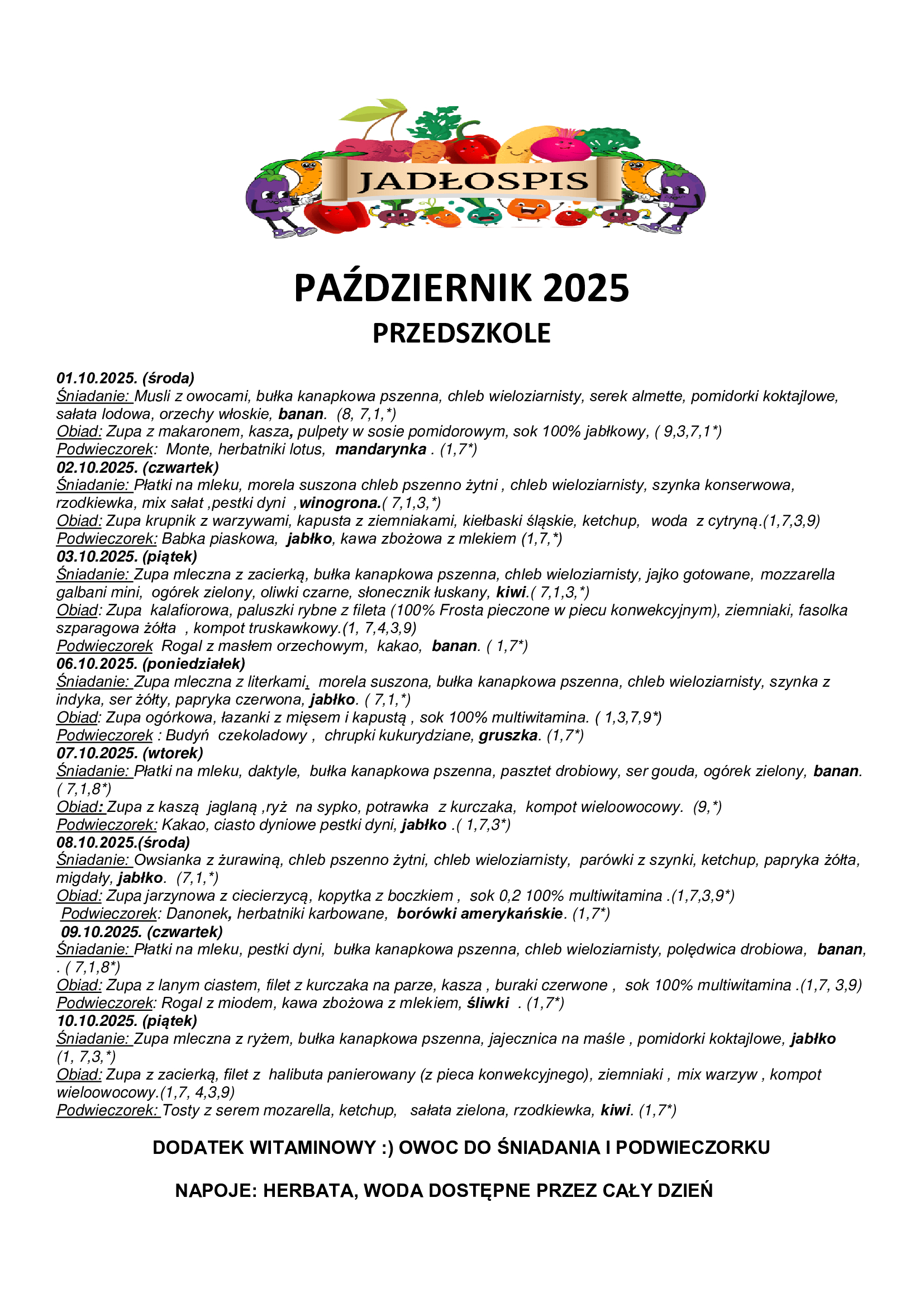 Jadłospis Przedszkole 01.10.2025 r. - 10.10.2025 r.