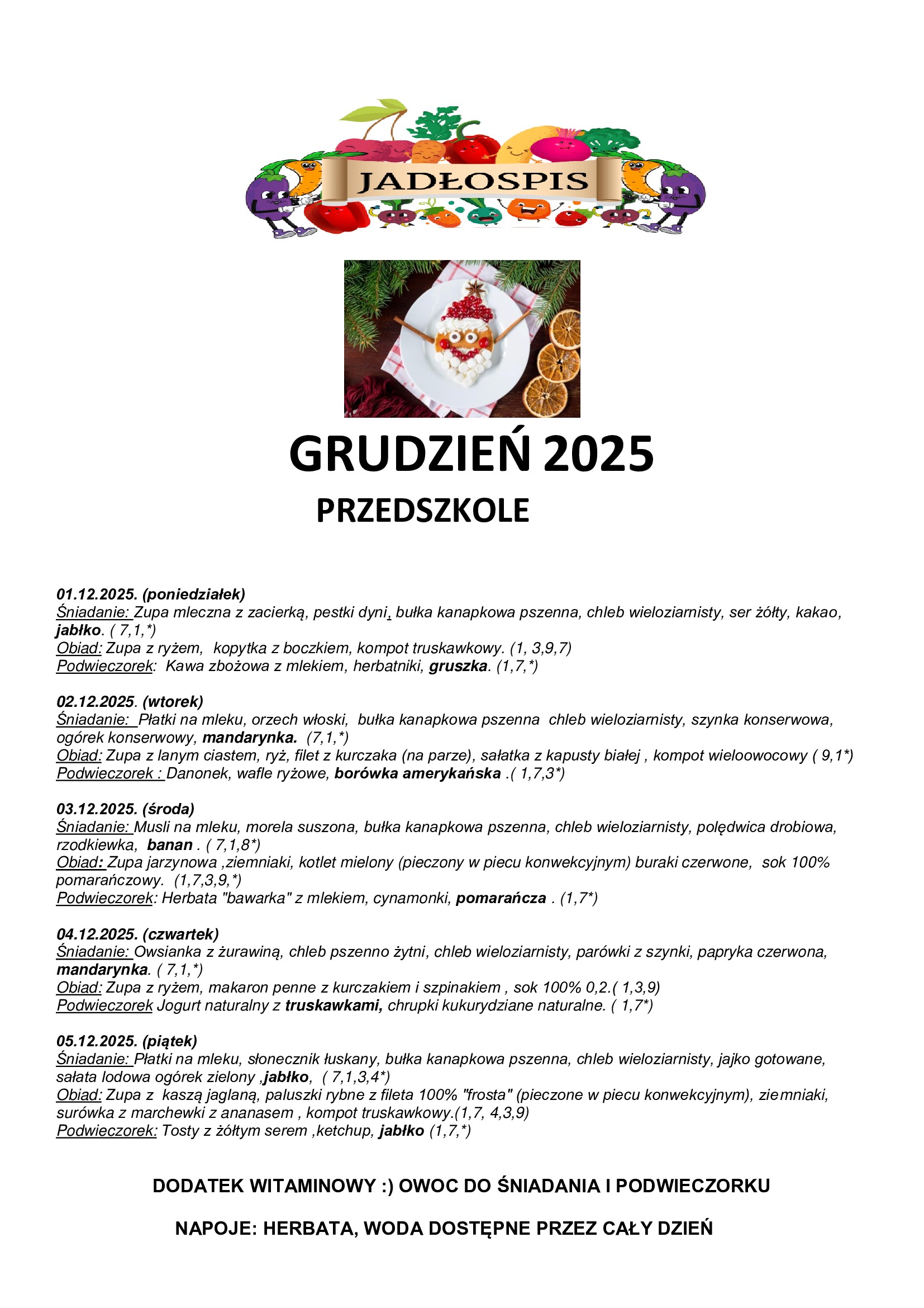 Jadłospis Przedszkole 01.12.2025 - 05.12.2025