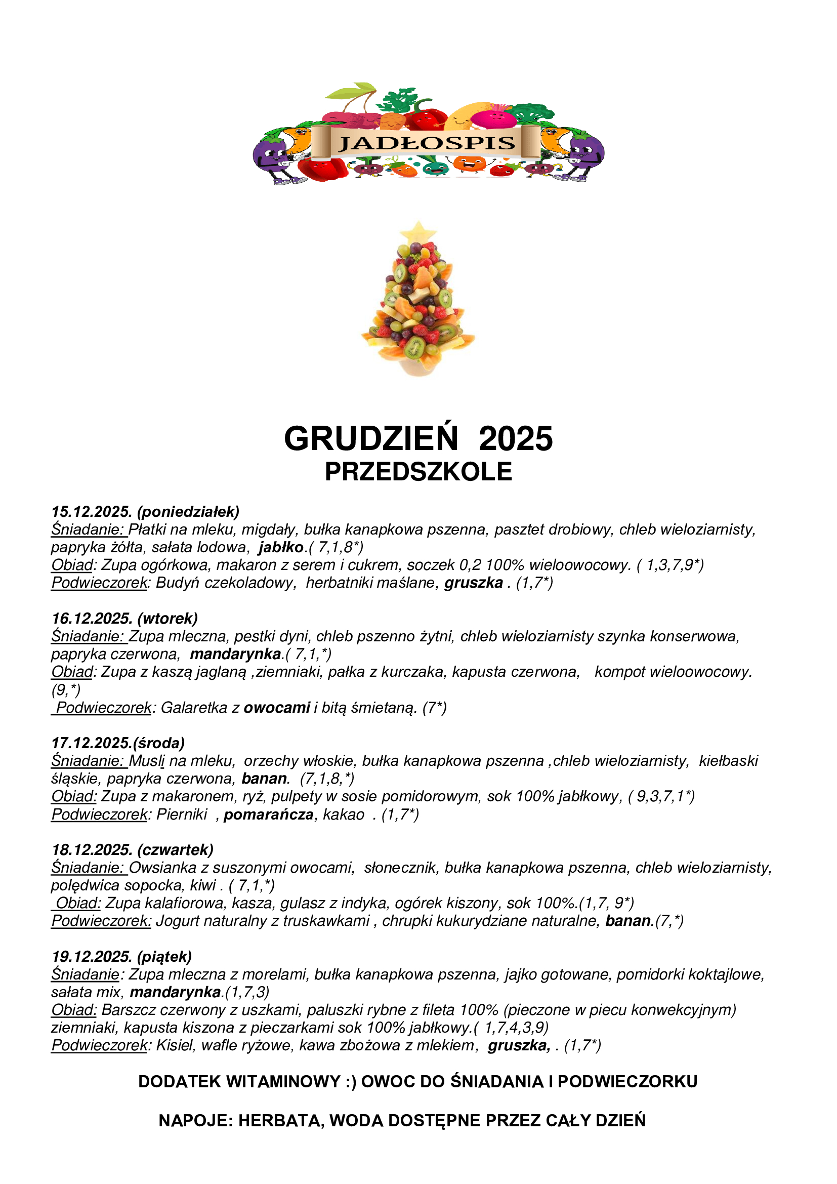 Jadłospis Przedszkole 15.12.2025 r. - 19.12.2025 r.