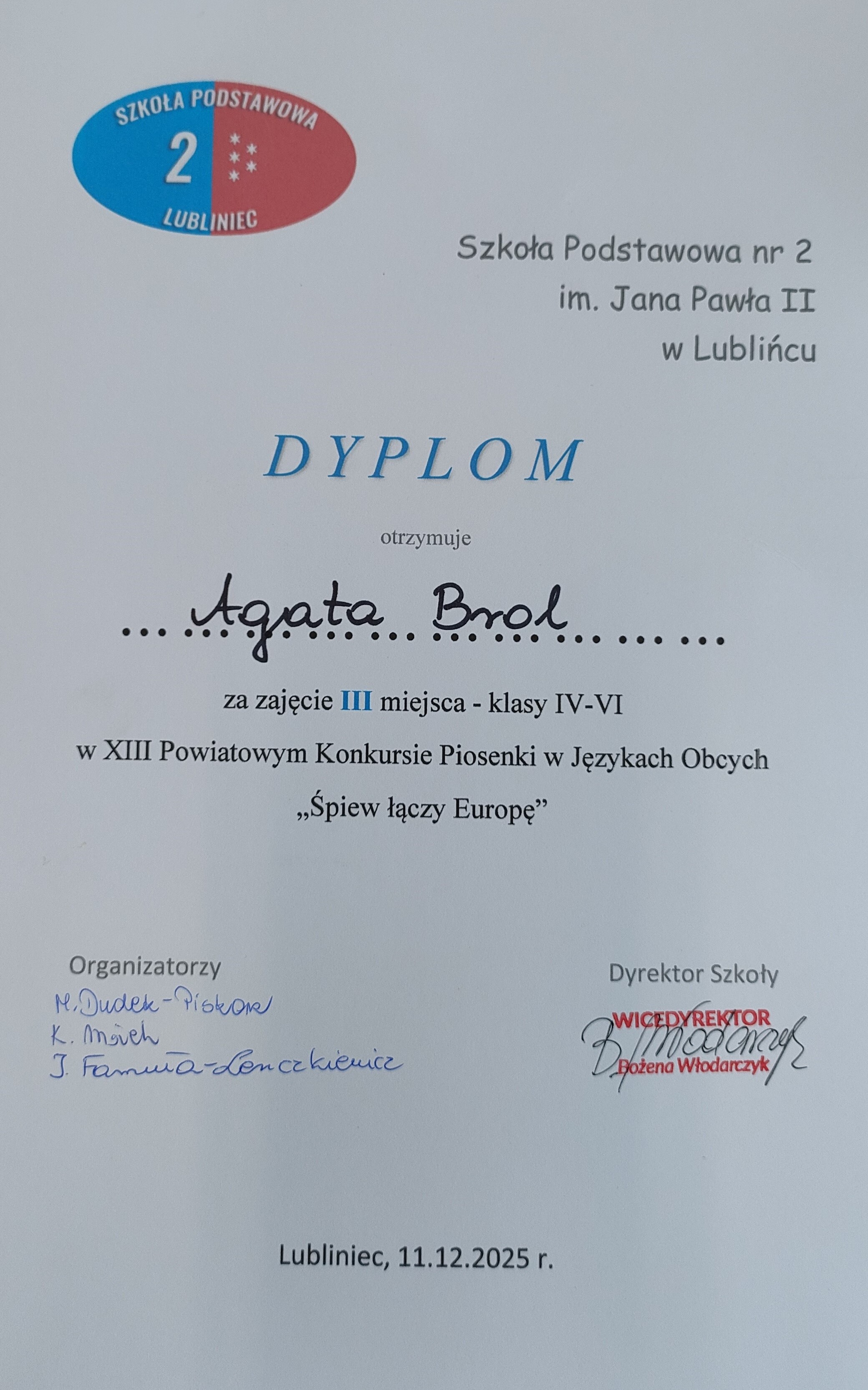 11 grudnia 2025 r. w Szkole Podstawowej nr 2 w Lublińcu odbył się XIII Powiatowy Konkurs Piosenki w języku obcym "Śpiew łączy Europę". W konkursie wzięli udział uczniowie z 13 szkół powiatu lublinieckiego. Utwory wykonane przez wokalistów w języku angielskim były na niezwykle wysokim poziomie. Uczennica naszej Szkoły Agata Brol zaśpiewała piosenkę "Stand by me" i zajęła 3 m - ce w kategorii klas 4 - 6.